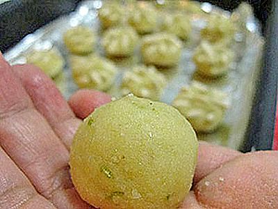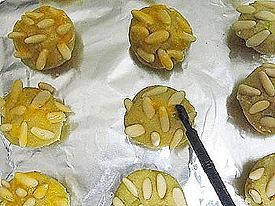 2. Volver a trabajar la masa. Cuando esté bien homogénea, hacer bolitas de masa, con cuidado de que que queden del mismo tamaño. Colocar los piñones en un bol y pasar por él las bolas, para que se queden pegados los piñones.