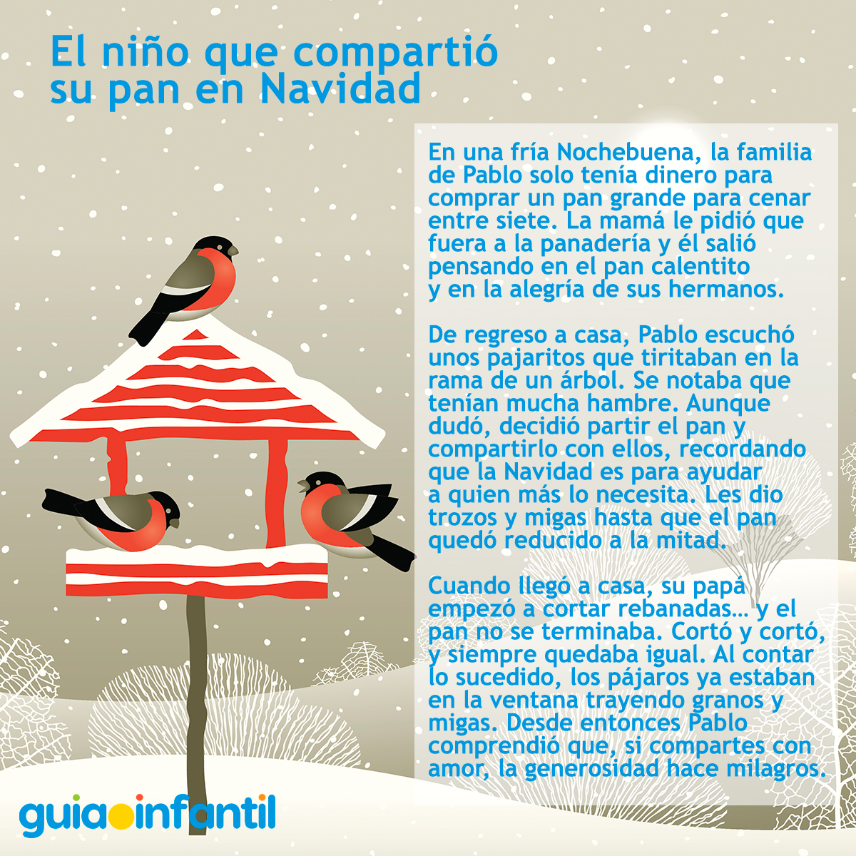 En El niño que compartió su pan en Navidad, un cuento corto navideño infantil, los pequeños conocerán la historia de Pablo, un niño que a pesar de vivir en una familia muy humilde, decide compartir el único pan de la cena con unos pajaritos en plena Nochebuena. Lo que parece un simple gesto se convierte en un verdadero milagro navideño gracias a la 'magia' de la solidaridad y la gratitud. Sin duda, un cuento sencillo y tierno que ayuda a los niños a comprender que el verdadero espíritu de la Navidad está en abrir el corazón, pensar en los demás y aprender a compartir.