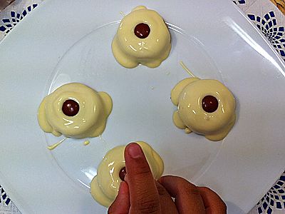 2. Deja que de enfríen ligeramente, pero sin que llegue a solidificarse. Coloca lacasitos a modo de ojos en el centro de cada galleta. Llevar a la nevera y enfriar durante 15 minutos.