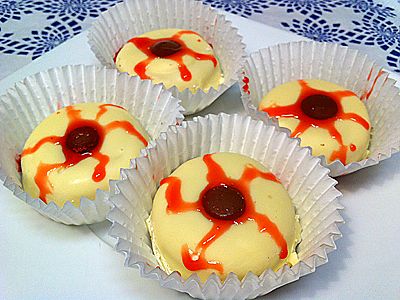 4. Ya tienes listos tus ojos sangrientos, crujiente galleta recubierta de chocolate y fresa. Buenísimos y ¡listos para asustar!