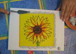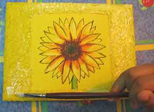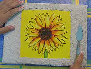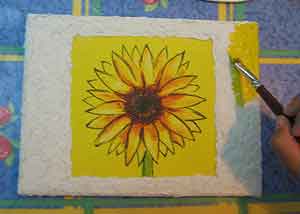7. Cuando la pasta esté seca, hay que pasar la pintura amarilla para marcar la textura.